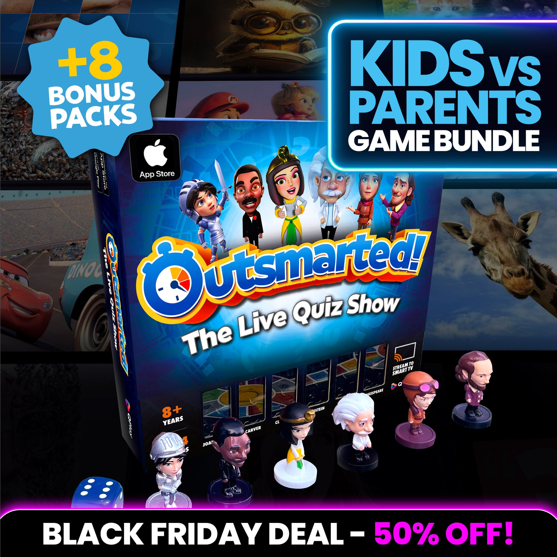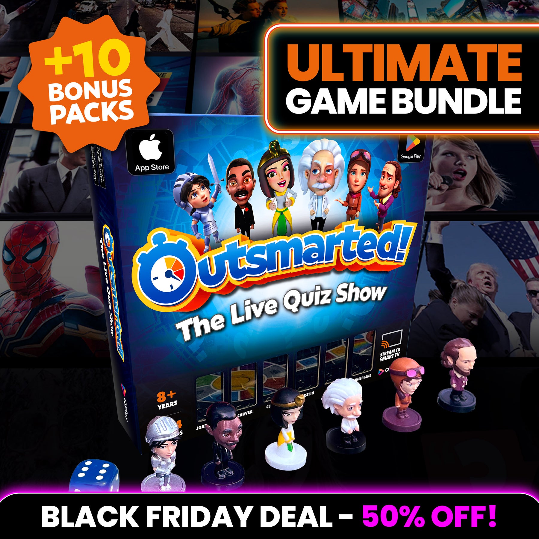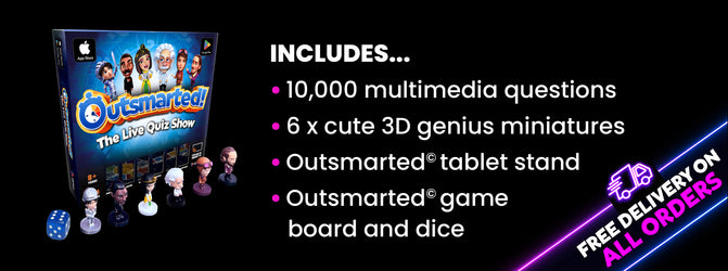 Outsmarted comes with 10,000+ questions brought to life with images, song clips and video. Divided into 10 core categories, they offer a perfectly balanced challenge for the whole family. The 10 core categories: Breaking News, Quick Thinking, Sound & Music, Pub Quiz, Back to School, TV, Film & Books, Sports & Leisure, Lifestyle & Culture, Science & Nature and History & Geography. In addition, there's always a selection of free bonus categories in the Outsmarted app.